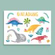 Einladungskarte zum Kindergeburtstag mit Dinosauriern. Mit vorgefertigtem Text und Lücken zum Ausfüllen (Datum, Uhrzeit, Telefonnummer)